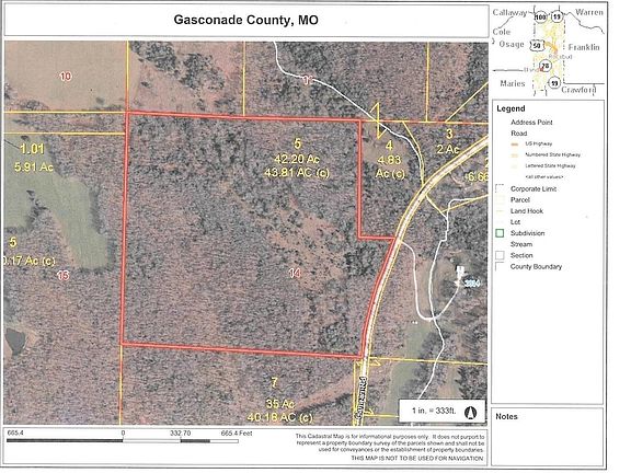 YOUR OWN PIECE/PEACE OF THE COUNTRY!!! 42.2 ACRES IN SOUTHERN GASCONADE COUNTY! Great for recreation or for your new homestead! About 3/4 wooded and 1/4 semi-open. Claypit/pond. Great for hunting, hiking and enjoy nature. Also a wonderful place for your new home-sweet-home!