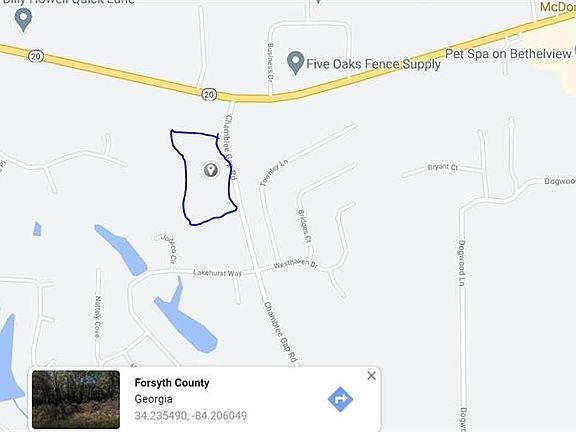 Current Zoning is A1 Residential. The lot is at the corner of Hwy 20 and Chamblee Gap Road. It's wooded and undeveloped 2 acres. Chamblee Gap is off Bethelview. The lot goes down hill ending at a stream in the back. A house could be built near the front by the road or farther back. If you are standing on Chamblee Gap Rd, it's on the left of lot 3523 Chamblee Gap Rd, Cumming, GA 30040. This lot is surrounded on the left and back by a new neighborhood called Reserve At Lakeview. The lot kind of goes down hill ending at a stream in the back. A house could be built near the front by the road or farther back. It's not behind another lot or anything.