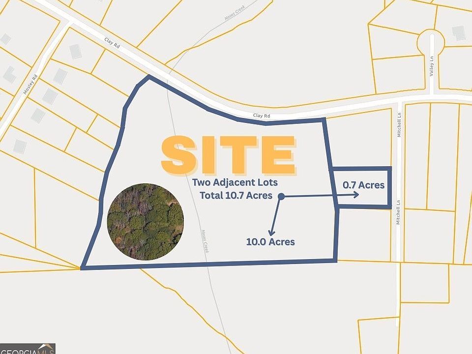 Opportunity for a tailored residential project or a custom home build on 10.7 acres of private, wooded land, zoned R-20 (Single Family Residential). This expansive offering combines two adjacent lots (10.0 acres at 0 Clay Rd and 0.7 acres at 4744 Mitchell Ln). The property is conveniently located near parks and trails, as well as an array of shopping and dining establishments. Austell is located less than 20 miles west of downtown Atlanta. The city has easy access to I-20 and I-285. Austell is within the prestigious Cobb County School System.