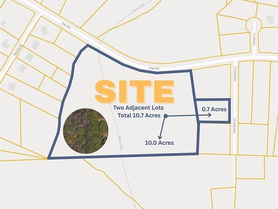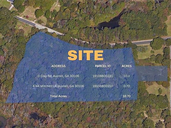 Opportunity for a tailored residential project or a custom home build on 10.7 acres of private, wooded land, zoned R-20 (Single Family Residential). This expansive offering combines two adjacent lots (10.0 acres at 0 Clay Rd and 0.7 acres at 4744 Mitchell Ln). The property is conveniently located near parks and trails, as well as an array of shopping and dining establishments. Austell is located less than 20 miles west of downtown Atlanta. The city has easy access to I-20 and I-285. Austell is within the prestigious Cobb County School System.