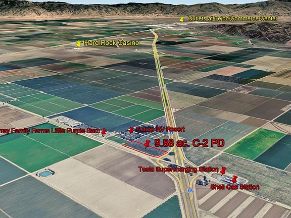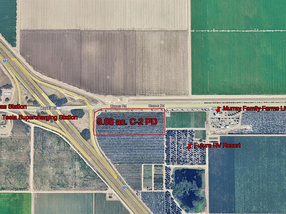 9.88 acres of commercially zoned land (C 2PD) with direct freeway access at Interstate 5 and Copus Road. The property offers high visibility from the highway and is situated immediately adjacent to the Murray Family Farms Little Purple Barn, providing strong exposure to local and regional traffic. Utilities are available at the site, including power, and water which is served by an agricultural well through the Arvin Edison Water Storage District, supporting both interim agricultural use and future commercial development. The parcel is currently planted to cherry trees, with the 2026 harvest excluded from the sale. Seller would consider a lease-back or custom-farming arrangement with new owner. Located less than five miles from Hard Rock Casino Tejon, this parcel offers an exceptional opportunity for highway-oriented commercial, service, or investment uses, while also benefiting from existing agricultural production. Buyer to verify zoning, utilities, SGMA and permitted uses.