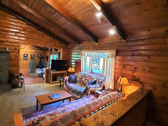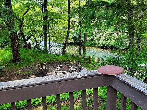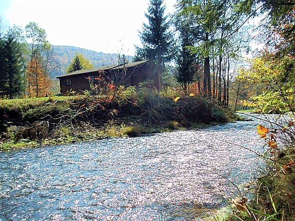 PAPAGUNK LODGE ON THE UPPER EAST BRANCH (A FLYFISHERMAN'S DREAM) An absolutely beautiful log home built on the bank of the upper East Branch of the Delaware River. This quiet secluded 5.2 acre parcel is a mixture wildlife habitats, trails thru old meadows that wind through a bird sanctuary, a grove of mature hardwood trees, and a portion of an island in the middle of the river. A meticulously maintained open concept log home with cathedral ceilings and beautiful woodwork throughout. Containing a modern kitchen with a stove refrigerator and a dishwasher that shares the great room with a living area accented by a large workable fireplace made of local bluestone. The step down dining room/living room has hardwood floors and a picture window overlooking the river. A glass front artificial log propane stove sits on a bluestone slab and completes the room. Ceiling Fans in both spaces keep the air circulating around the rooms. Two bedrooms, one containing a queen bed and the other has a king bed along with a large closet and picture window. A full bathroom with a tub completes the upper level. An open hallway staircase leads to the lower level with another large open room and a wood burning stove. This makes a great combination living and sleeping area along with a kitchenette and another full bathroom. A separate utility room with washer and drier hookups completes the lower level. This area is also accessed by its own outside entrance way. A nice deck is attached to the side of the house and overlooks the river and a fire pit and outdoor seating area sits atop of the river bank. A large stand alone two car garage with a metal roof and concrete floor also has a back room which would make a great workshop. Electric service is already provided to the garage. A large woodshed with a brick floors keeps your firewood supply safe and dry all year long. The property is accessed by a short flat 25 foot wide right of way road from the town maintained highway, which goes through a gate into the parcel and ends in a circular loop. Numerous trails are cut through the property for fantastic bird watching and wildlife sightings. The property also encompasses a large portion of an island located between two branches of the river, but the house sits above the flood plain. The cold waters of the Delaware river support a healthy concentration of trout and make a premier spawning area . This is a fly fisherman's dream. Located in the low taxed town of Colchester and minutes from Downsville for all your shopping and dining needs. Just over two hours from the George Washington Bridge this is your perfect getaway home or even rent part time as a very desirable Airbnb.