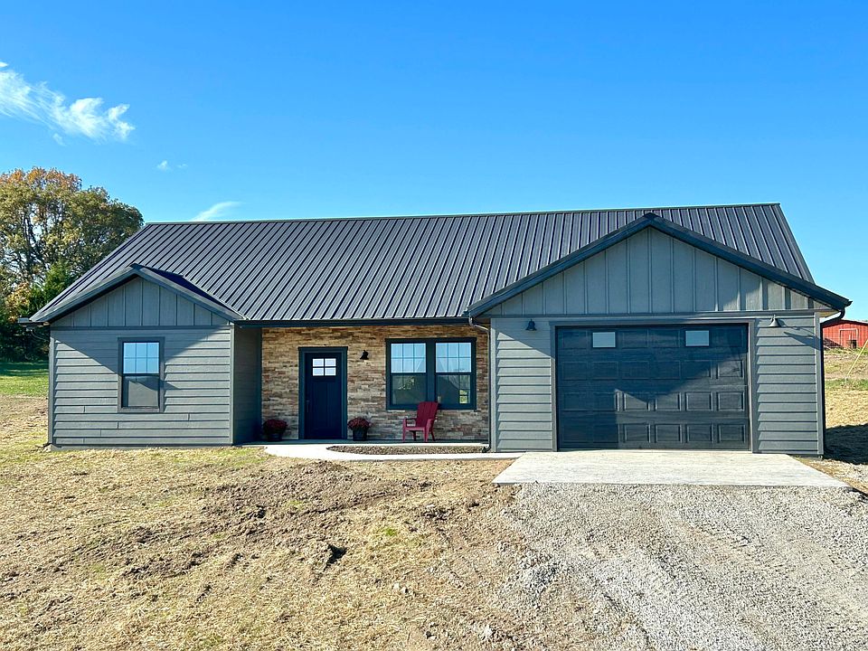 This stunning home sitting on 2.8 acres offers panoramic views of the Ozark Mountains and a spacious, open-concept layout. It features 3 bedrooms and 2 bathrooms with a split bedroom design for added privacy. The kitchen is equipped with an eat-at island, soft-close cabinets, and new appliances. Elegant quartz window sills that match the kitchen countertops enhance the home's aesthetic. Including 9 ft ceilings throughout the home! The bathrooms include smart switches controlling lighting and Bluetooth for music, with the master bath featuring a relaxing jetted tub. The laundry room that sets nicley just off the living area with a new washer and dryer adds convenience. The front porch boasts a charming accent wall with LP siding. Move-in ready and well-built, this house requires no hassle of purchasing appliances--perfect for your new start!