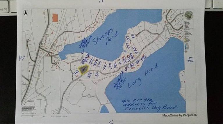 Superior 1.8 acre Level Wooded Lot. Located 500 Feet from Sheeps Pond edge and 800 Feet from Long Pond edge on Crowell's Bog Road between #341 (to west) and #371 (to East) or second lot east of Crowell's Bog and Storrow Road intersection. Deeded beach rights to both Long Pond and Sheeps Pond. Private wooded lot on highly sought after, exclusive street where average home price and value are north of $1.1 million. Neighboring homes include 316 Crowell's on market for $3.25 million, 560 Crowell's on market for $1.48 million, 555 sold for $1.425 in 2014, 524 sold for $1.1 July 2015 and 573 sold for $1.375 June 2014. Adjacent home at 371 valued at $2.1 million. Owner purchased in November 2013 with plans to build but now remaining in Virginia. It was just surveyed so look for the corner stakes with flags.