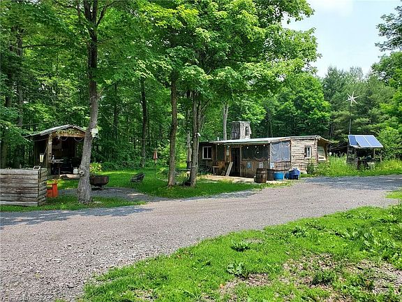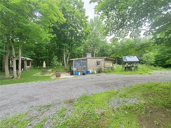 BACK TO THE LANDERS, HIDE AWAY SEEKERS, NATURE LOVERS OR RECLUSE WANNABES, this is the place for you. 50 acres, almost all woods, very private on a seasonal road that is kept open by private individuals in winter. A pretty rustic cabin has been added to a camper trailer so has 1-bedroom, open kitchen sitting area with pull out futon. All insulated, has propane appliances, solar power runs lights, tv etc. Garage building for storage with an added-on sugar shack all set up with evaporator, 3 filter sap running system, various other smaller buildings for storage of diesel generator, cook house by the firepit, storage buildings and a privy. Seller has some line tubing run and lots of buckets to tap 300 maple trees and says could easily do up to 500 trees. Very private location, no close neighbours, buildings off the road by about 500 ft so not visible. Buyer to perform own due diligence regarding zoning and provincial ANSI .