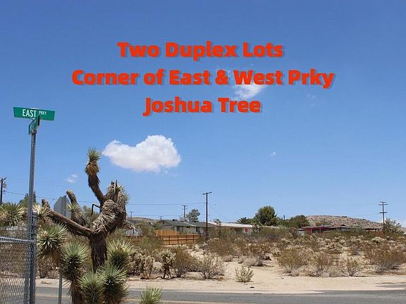 E. PARKWAY & W. PARKWAY, JOSHUA TREE: $38,000.00 Duplex lot 7200 sq ft. also available is multi-family lot next to this lot. Walking distance to down town Joshua Tree. This multi family lot is flat and ready to build. The electric and water are to the lot. Paved road with street lights. Lovely mountain views from the lot. Irregular dimensions. Owner will carry 1st trust deed of $30,400.00 with 20% down 7,600.00. @ 7% interest amortized over 5 years payable $601.96 month +$15.00 monthly loan service fee. Directions:From Hwy 62 go North on Park Blvd. to corner of E. Parkway and W. Parkway. 2nd lot from corner. APN#0603-243-08-0000.