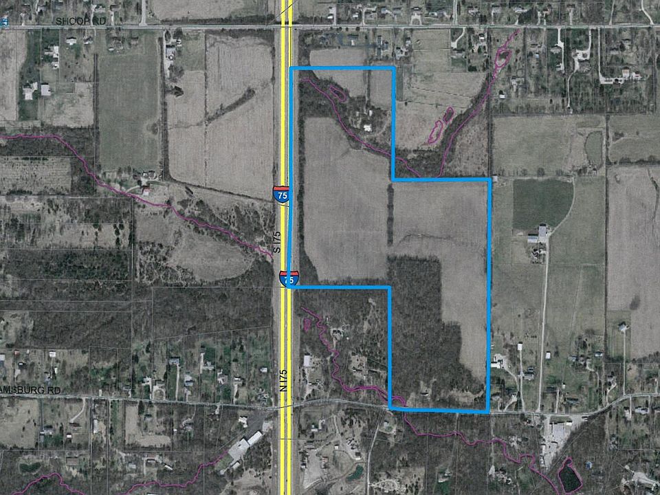 63.5 acres with agriculture zoning and frontage on Ginhamsburg Rd on the south side and a 50'' easement off Shoop Rd. to access the land from the North side. Over 1500 feet of frontage along I-75 along the West property line. Located just South of Tipp City.