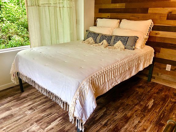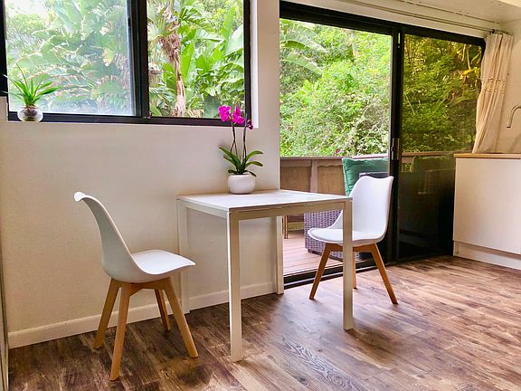 For a single occupant only. Jungle & Mountain View studio, utilities included. Tree house like entrance is low, someone taller than 5' 3" would need to lower the head. The unit itself has higher than normal ceiling height. Modern rustic style unit with fun artistic flavors with industrial pipe railings, chalk board wall, floating toilet, art gallery like lighting. Surrounded by tropical jungle, it's filled with fresh mountain air and it's like living in a bird sanctuary or a retreat in nature. Located on a quiet Cul de sac that's on hillside by a preservation land. With no traffic noise, you will hear sound of wind, rain and birds. 10 mins drive to Wholefoods in Kahala. Fully renovated kitchen, flooring, accent walls, fridge, induction cooktop, convection microwave, garbage disposal, sink and faucet, toilet, blinds, ceiling fans. Full size convection microwave has bake, broil and roast cooking options. The unit comes with mattress & frame, dining set, lanai chair set. Bedding, plants, decorative items are not included. A part of a house but a completely separated entry, laundry on site, Wifi and utilities are included, street parking. Long stairs, not safe enough for kids or elderly. It's an open floor plan with industrial pipe clothing racks, no closet. Would not work for someone who has a lot of stuff. No AC, no pet, available now. Furnished studio for a single occupant with 1 car only.