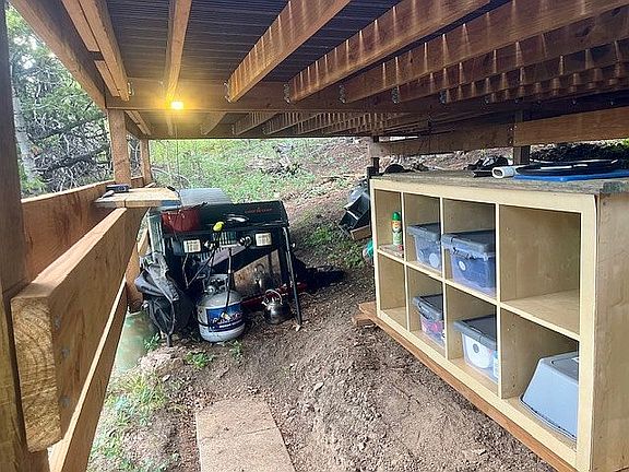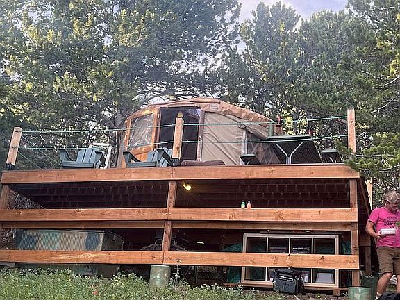 A 12' 4-season insulated yurt with wooden front door, two windows and large skylight dome. Wall-vented wood stove and solar lights make this a cozy, year-round camp. Yurt is built on a 20'x20' Trex deck with railing. Adirondack chair sitting area and picnic table create a beautiful outdoor living room. Galley kitchen with two-burner gas stove built under deck. All weather outhouse with composting toilet 50 feet from yurt. Large shed/shelter with metal roof 150 from yurt. Built for gear storage and/or extra sleeping space.