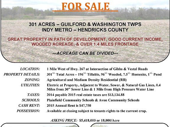DEVELOPMENT LAND FOR SALE: 301 ACRES - GUILFORD & WASHINGTON TWPS INDY METRO - HENDRICKS COUNTY GREAT PROPERTY IN PATH OF DEVELOPMENT, GOOD CURRENT INCOME, WOODED ACREAGE, & OVER 1.4 MILES FRONTAGE Contact Jim or Sam Clark today for more information: 765-659-4841 or jimc@halderman.com or samc@halderman.com ACREAGE: 301.48+/- Total Acres – 196+/- Tillable, 96+/- Wooded, 7.5+/- Homesite, 1+/- Pond; Owners are Open to Dividing Acreage LOCATION: 1 Mile West of Hwy. 267 at Intersection of Gibbs & Vestal Roads ZONING: Agricultural and Medium Density Residential (RB) UTILITIES: Electric at Property, Adjacent to Water, Sewer, & Natural Gas Lines, 0.4 Miles from 30” Sewer Line & 1 Mile from High Pressure Water Line TAXES: 2014 payable 2015 real estate taxes are $13,134.88 SCHOOLS: Plainfield Community Schools & Avon Community Schools (see brochure for details) CASH RENT: 2015 Annual Rent is $47,750 POSSESSION: Available at closing subject to tenants rights to the current crop. BUILDINGS: 1800 sq ft, 1-Story Ranch Home: 4 BR, 1 BA, Full Basement; Horse Shelter; 5 Grain Bins; & Old Bank Barn
