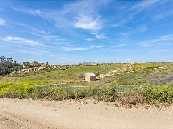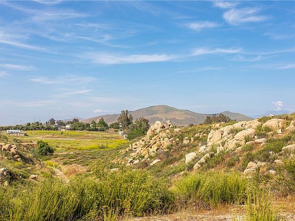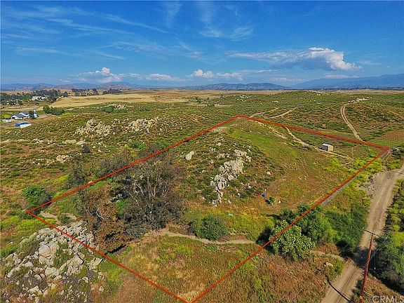 Due east of French Valley Airport and Pourroy Road this beautiful property is conveniently located in the heart of French Valley. At the center of the property is a ridge with beautiful rocky outcroppings which offers panoramic views of the surrounding hills and mountains and can be perfected into a home site. Along one side is a sparkling seasonal stream and trees. Owner has partially fenced the property and added a shed and three fruit trees. It is located in an area of custom homes and manufactured homes. There is electricity at the street, no homeowners association, and low taxes. Shopping and schools nearby. Must see this property to take in all the amenities. Seller financing now available on this property - call me for details.