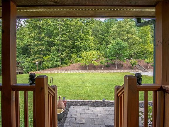 Private with a beautifully landscaped front yard sits this log home with a 3 sided wrap around porch. Enter thru French doors into the dining room, then the living area to the left w/ a stack stone gas log fireplace w/ Maple flooring. The kitchen has tile floors, custom white hickory cabinets, tile backsplash, an island, pantry & breakfast nook. Also on the main level is the master en-suite w/ stack stone & tile walk-in shower & shoe closet. The upstairs floors are Hickory w/ 2 lg. bedrooms containing built-ins for storage, plus additional storage behind the closets. Also a bonus room w/ lots of natural light that would make a great office or craft room. In the basement is the family room w/ vinyl plank flooring, shiplap walls & ceiling and a stack stone fireplace plus another full bathroom. The other half of the basement is a large craft room and lg pantry w/ freezer. Two other buildings on the property: one currently called the "Party House" is 31 x 23 w/ vaulted ceilings, hardwood floors, 1/2 bath & kitchen area & below is a dream 600 sq ft workshop; the second building is a "treehouse" w/ hickory frame, windows and laurel railings around the porch. Only 5 min from town!
