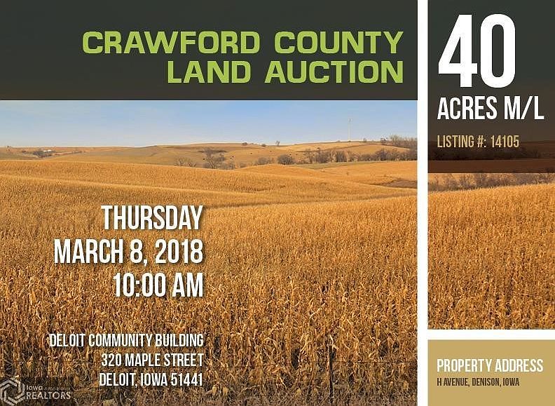 Peoples Company is pleased to present 40 Acres M/L of Crawford County, Iowa farmland. The farm is to be sold as a single tract at public auction on Thursday, March 8th, 2018. The auction will take place at 10:00 A.M. at the Deloit Community Building in Deloit, Iowa. The tract has approximately 30.96 M/L FSA cropland acres with a CSR2 of 70.3. Primary soil types include Marshall and Judson Silty Clay Loams. This farm would be a great add-on unit to an existing operation, affordable purchase for a Beginning Farmer / Investor, or potential to be purchased in an IRA or 401K. Grain markets are close with options between Andersons Ethanol Plant located just south of the farm in Denison, Iowa and a wide variety of grain elevators to utilize as well. Farming rights for 2018 will be available to the Winning Bidder. The farm is located just east of Deloit, Iowa and in Section 3 of Milford Township. The west boundary line of the property will be marked.
