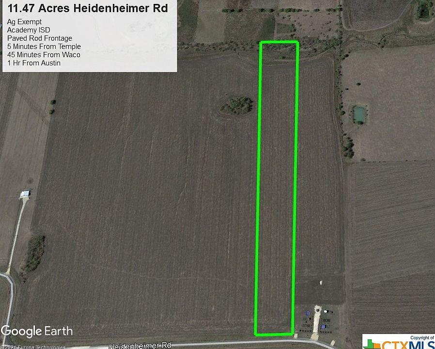 Nice 11.47 acre property in Academy ISD. Land sets up well for a homesite with rural water access and is a great size for a small farm with enough room for your favorite farm critters. Almost 240' of paved road frontage that is 5 minutes from Temple, 45 minutes to Waco and a little over an hour to Austin. Property has been farm land for many generations and is currently under ag exemption. Water line in place and meters are currently only $1200. Restrictions attached at closing. Beautiful sunsets are waiting. OWNER FINANCING AVAILABLE!