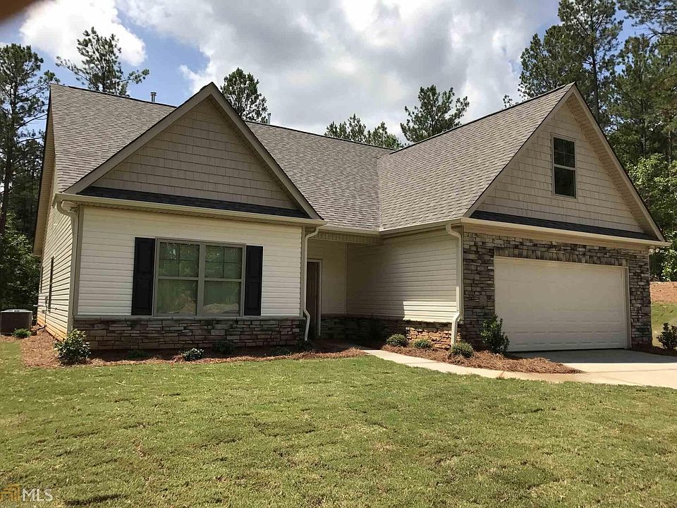 The Albany B Plan with Bonus room. Master and 2 secondary bedrooms on main, large Family room with Fireplace, Kitchen has granite counter tops, appliances include Stove/Range, dishwasher, microwave and refrigerator. Large master bedroom/master bath with double vanities, separate shower, tile floors. Large wooded lot.