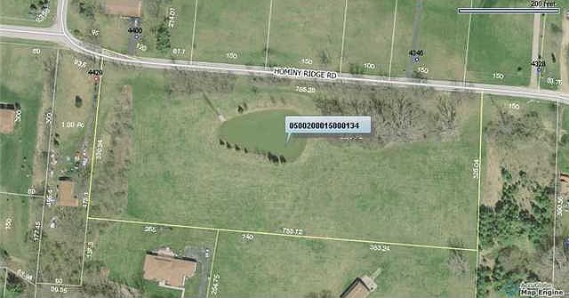 5.86 acre building lot adjacent to Beechwood Hills. Over 780 feet of road frontage on Hominy Ridge with homes on Moss Point Lane to the rear. Some mature trees & pond. Great building site!