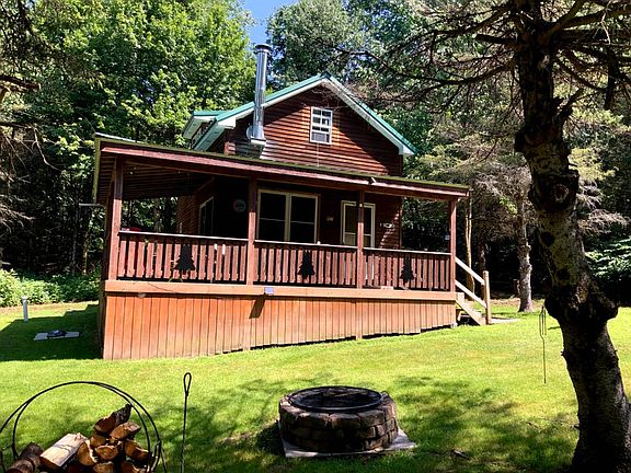 3.43 acre Sportsman's Camp For Sale, Florence NY! Tug Hill Custom Cabin Bordering Fall Brook State Forest! 3.43 acres with a custom woodland cabin boasting all the comforts including a kitchen area, bathroom, wood stove, propane heat monitor to take the edge off. Ideal location for hunting as it directly borders Fall Brook State Forest and is directly across the road from the Johnny Smith pond, loaded with bass and panfish. This a very comfortable cabin with an upstairs sleeping area covering 3/4 of the second floor and overlook below. There is comfortable furniture, bar area serving as a tabletop in center of living room, large back covered porch looking down a groomed grass yard, and bass pond on the bottom of the hill. Generator shed with additional storage. Houlahan road is groomed snowmobile trail leading to 46 corners. 15 minutes to Camden, NY. 20 minutes to Salmon River area. Protected gate leading into the property. Northern Zone hunting in 6K. Well maintained and cleverly constructed....incredible setting on a hill overlooking pond below. Walk right into 14,000 acres of state forest and hunt, hike, explore, fish neighboring ponds and experience the best of the Tug Hill has to offer.