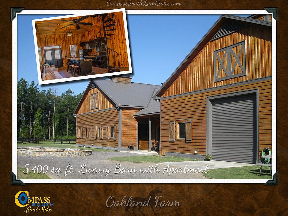 A 5,408 sq ft horse barn that includes eight custom built 12×12 stalls, a 2,400 sq ft equipment area and an 800 sq ft apartment which has a full kitchen, tack room, full bath and loft bedroom.