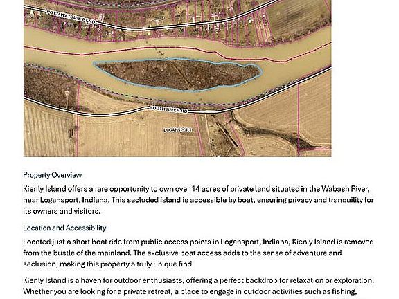 Kienly Island offers a rare opportunity to own over 14 acres of private land situated in the Wabash River, near Logansport, Indiana. This secluded island is accessible by boat, ensuring privacy and tranquility for its owners and visitors. Located just a short boat ride from public access points in Logansport, Indiana, Kienly Island is removed from the bustle of the mainland. The exclusive boat access adds to the sense of adventure and seclusion, making this property a truly unique find. Kienly Island is a haven for outdoor enthusiasts, offering a perfect backdrop for relaxation or exploration. Whether you are looking for a private retreat, a place to engage in outdoor activities such as fishing, camping, and hiking, or a unique site for development, Kienly Island presents endless possibilities for recreation and enjoyment. Contact Information *Note that only serious buyers with proof of funds will be considered, and visitors are asked not to park along the road to view the property.