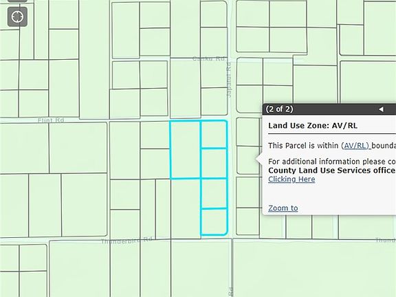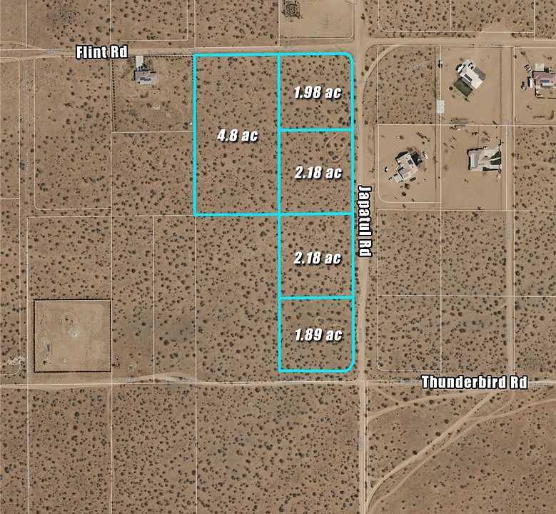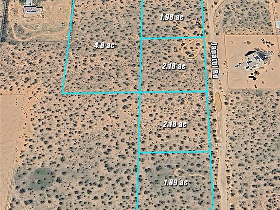 5 Residential Lots at the Southwest corner of Japatul Rd and Flint Rd in East Apple Valley. County Jurisdiction. Lot sizes: 4.8 ac, 1.98 ac, 2.18 ac, 2,18 ac & 1.89 ac. Zoned Rural Living, 2.5 ac min lot size. This is a well area. Remnants of old well at 0437-361-88, condition or useability unknown. Located 1 mi from Joshua Rd (Paved) or 1 mi from Standing Rock Rd (Paved). Sale includes APN's: 0437-361-86, 87, 88, 89 90.