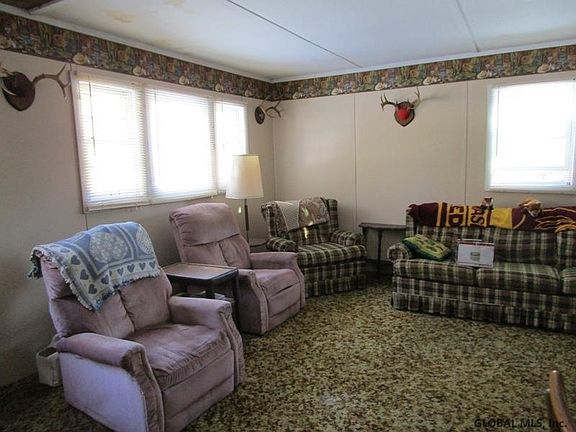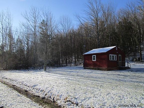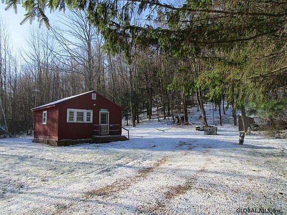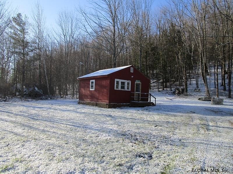 Cozy one room camp with electricity, on quiet country road, rear boundary of property borders large tract of State land ( Bear Swamp) Lawn area around house, wooded behind home. Excellent hunting, snowmobiling, easy drive to Cobleskill or Cooperstown. Country setting on plowed road, yet minutes to State Rt 165. Owner uses a propane space heater, says cabin is well insulated. Kitchen area, two sets of bunk beds, living room area all open. Trail through woods to state land.