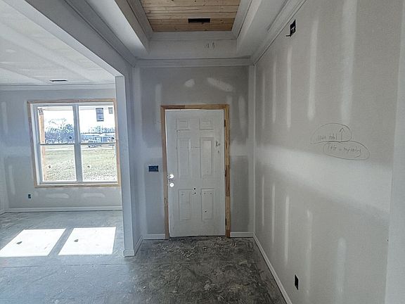 The open-concept living plan features 3 bedrooms and 2 bathrooms, highlighted by luxury vinyl plank flooring throughout the main living areas, creating a seamless flow ideal for everyday living and entertaining. Elegant crown molding enhances the primary bedroom, primary trey ceiling, formal dining room, and foyer trey, adding timeless architectural detail.