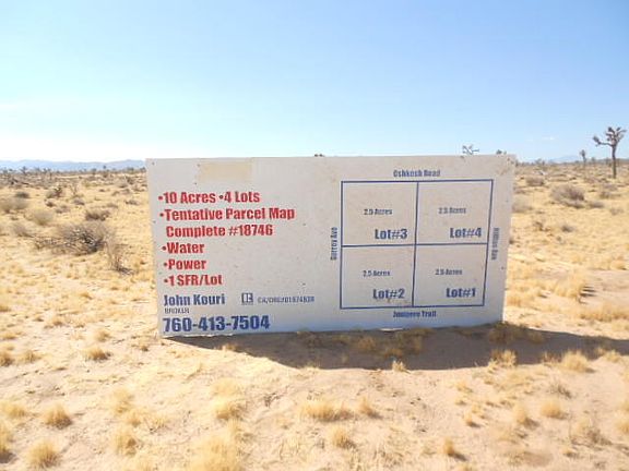 10 Acres - Tentative Parcel Map Complete with Four 2.5 Acre Residential Lots! NOT divided yet! Water & power already in (fire plugs right across the street). Many nice homes next door & across the street. All the hard work has been done. Soils tests, percolation tests, geotechnical reports, environmental reports(no tortoises or owls per report), surveys, on and on. Lots are flat and all area is buildable. Build 4 houses or one big compound. Several homes in the area. Build a home for yourself and build a few spec houses. All maps and studies included of course. Very close to Yucca Mesa Elementary School, Yucca Mesa Community Center and San Bernardino County Fire Dept. #42. Junipero trail is a well maintained(by a local resident) firm unpaved road. Just a couple of hundred yards to Avalon Road(paved).I would consider a ground lease for raising/boarding animals! APN: 0631-021-017-0-000. Check with County for possible uses. Buyer to do due diligence! Information deemed accurate but not guaranteed. Sold 'As Is'! Tentative Parcel Map attached in ''DOCS''! With full price offer, seller to credit buyer $7,400, the approximate cost to install water meter per Hi-Desert Water Agency!