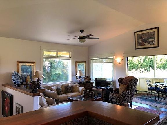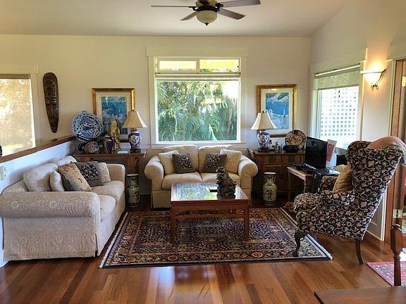 Elegantly fully furnished and stocked 2 story home on a large acre property close to the Five Corners area in Haiku, gated. 998sf of living space with an attached 1 car carport and 2 large covered lanais, upstairs and downstairs. The 2 bedrooms and bathroom are downstairs (shower only in the bathroom), the living quarters are upstairs. Kitchen has granite countertops. Travertine floors downstairs and Brazilian cherry hardwood upstairs. Bedrooms have queen and double size beds. Stove is gas. No split or central a/c but 2 portable a/c units in each bedroom and 1 in the living room. This home is peaceful and very private, perfect for an artist, a writer or just to enjoy life on Maui! Available starting July 15th, 2022 for long term rental, 6 months minimum. $3,500/month, one month security deposit. Rent includes water, sewer, refuse collection, local phone calls, internet (DSL) and twice monthly yard service. Tenants will be responsible for propane (stove and dryer), electrical and cable. No smoking, no pets (one small dog may be ok), not HUD approved. This rental is not a drive by as gated.
