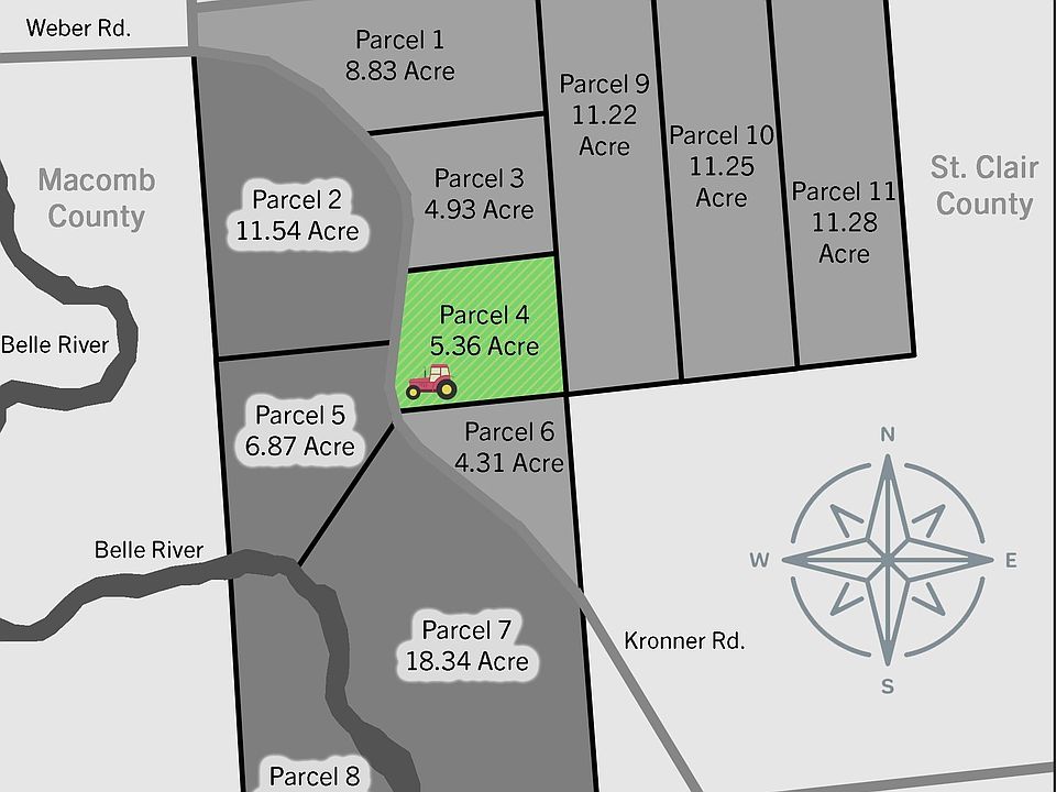 An incredible opportunity to own an 5.36 acre strip farm in Columbus Township just off of Weber Rd! 451 ft on Kroner Rd x up to 550 ft deep. Close to Macomb County, this property was recently split from a larger parcel. Information available on bank lot loans.
