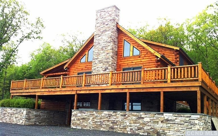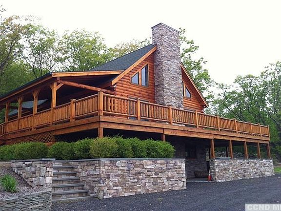 Conveniently located in the Windham area, this distinctive custom built log home sits on a mountain top with multi state views. Open-concept floor plan ,dining room, kitchen and living areas. 5 bedrooms, 3 full baths tile,granite and kohler fixtures. 24' vaulted ceilings, stone fireplace,wide plank wood flooring throughout.Large master suite with deck. Wall to Wall closets. Full walk-out basement ,media room, two guest bedrooms and full bath. Central AC, Generator ready , Two zone heating. Heated Garage, Wrap around porch, Bluestone walkways & patio pavers, stone walls and outdoor firepit. Designer Landscaping. 2.5 hrs from Manhattan and 6 miles to Windham's ski slopes.