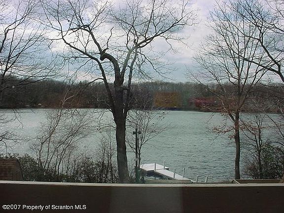 Moosic Lake Lakefront. Bank owned chalet w/ 3 levels of living space finished. 2 car garage w/ bonus room above it. stone fireplace in open LR/DR combo. oak kitchen open to LR/DR. Wrap around deck. wet bar in LL., private yard with dock. Peaceful and secluded yet minutes from town. Sold as is.Buyer pays all transfer tax., SqFt Fin - 2nd: 610.00