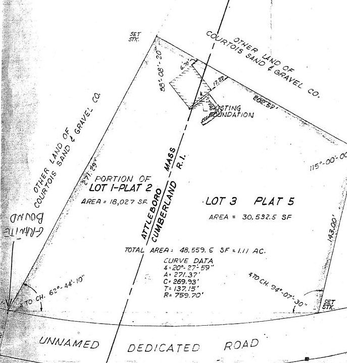 Over an acre of land consisting of 18,027+- square feet in Massachusetts and 30,532+- square feet in Cumberland, RI. A road extension will be required on the Attleboro, MA side in order to build. 1.11+- acres in total. City sewer on Mendon Road. Attleboro zoning is GR-B and land area would appear to allow up tot three units. Cumberland zoning to be researched further. Building/zoning inspector is out on Covid leave.