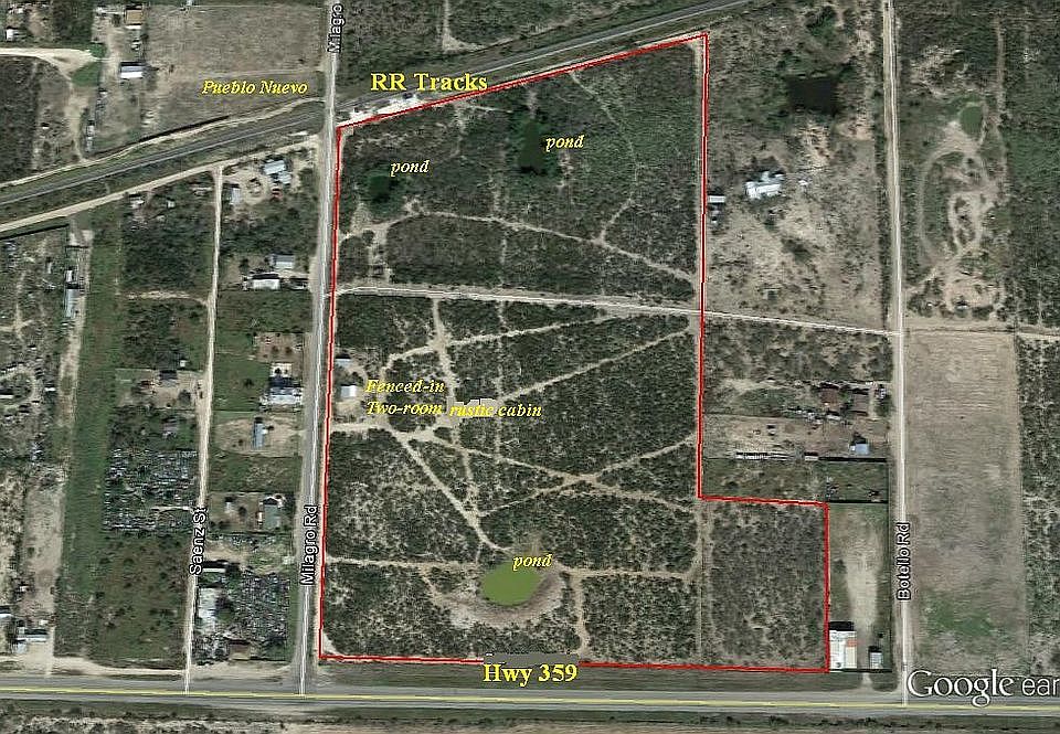 All 32.2666 acres are sold as is (We do not sell by acre or plots) 1. PROPERTY or land, improvements, accessories are as described: • The land situated is in WEBB LOT A & PT OF B &C LA COMA 32.2666 ACS also known as HWY 359/LA COMA RD • The Property is not subject to government programs • The Property is not located in a Texas Agricultural Development District 2. LISTING PRICE: $564,665.00 ($17,500 acre) Seller agrees to sell the Property for the Listing Price or any other price acceptable to Seller. Seller will pay all typical closing costs charged to sellers of farm and ranch real estate in Texas (seller's typical closing costs are those set forth in the farm and ranch contract forms promulgated by the Texas Real Estate Commission). 3. Financing – Seller does not finance 4. Sold as is 5. Services: • Land has electricity • Water is planned for the future 6. Dwelling • Fenced in two room rustic cabin with cement floors, electricity available; three doors with adjoining porch that has a large party cement tabletop • Covered area for cooking and stacking hay 7. Hwy 359 - will be expanded to four lanes (on frontage road) 8. Ponds - The acreage has three (3) man-made ponds 9. Vegetation – natural mesquite, cactus, anacua, cenizos, maguey and pitas (jashua tree) 10. Frontage - Acreage has frontage land facing Hwy 359 & Milagro Rd 11. Roads – encircles the ranch and along the mid-section 12. Pueblo Nuevo - Acreage is adjacent to the subdivision Pueblo Nuevo on Milagro Road • Milagro Road runs alongside the acreage Feel free to contact us at the email address listed to further discuss your interest in the purchase of these beautiful 32.266 acres of property. Thank you. A promising future investment for the possible expansion of Pueblo Nuevo