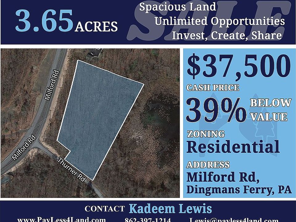 Build a Home Convenient to YOU on this 3.65ac with NO HOA FEES NO SUBDIVISION RESTRICTIONS!! ~~ Contact Kadeem Lewis to learn more: 862-397-1214 - lewis@payless4land.com ~~ WHY BUY?: NO HOA FEES NO SUBDIVISION RESTRICTIONS! #1. Create your dream home using your own vision! #2. 21 mins to downtown Milford, 30 mins to Stroudsburg & 40 mins to Lake Wallenpaupack. #3. Multiple Purchase Options Available! Make this incredibly discounted lot, which is selling 39% Below value yours for only $37,500 cash. COMMUNITY DETAILS: This is a rare find in the Dingmans Ferry area. Come escape from the hustle & bustle of everyday life and enjoy nature's serenity on these private, wooded 3.65 acres. Create a vacation home or a weekend getaway. And remember this land is only 1 hour 45 mins from NYC, 2 hours to Philly and 11 minutes from Dingmans Ferry Bridge, which is super convenient for commuters. Plus it’s very close to numerous State Parks and the Delaware River! This is a MUST SEE, connect with us now, while it’s still available! USAGE DETAILS: - Single Family Home PROPERTY DETAILS: - Lot Type - Land - Sale Price - $37,500 - State - Pennsylvania - County - Pike - Assessor's Parcel Number - 183.00-01-41 - Property Usage - Single Family Home - Property Address - 0 Milford Rd, Lot #: 26, Dingmans Ferry, PA 18328 - Size - 3.65Acre(s) - Road Access - Yes, Paved & Unpaved - Electricity - At the Street - Well & Septic - Private - Market Value - You are buying into EQUITY as similar land have sold for up to $60,000 ACCESS DETAILS: - Milford Rd is an paved road & Thurner Rd is a paved road - Lot GPS Coordinates: 41.179184, -74.919939 - 1508 Milford Rd is the address to the neighbors house, which is adjacent to the property POPULAR ATTRACTIONS: - Delaware Water Gap National Recreation Area, 2 minutes away - This area is one of the best spots for outdoor lovers to spend a weekend and it’s close to New York City. - Dingmans Ferry Bridge, 11 minutes away - Is a awesome piece of local history. - Promised Land State Park, 36 minutes away - The Promised Land really shines over the other state parks in PA, as it features everything you'd expect, but also has a beach! - High Point State Park, 30 minutes away - The monument is cool and there’s lots of hiking areas on the Appalachian Trails. - Lake Wallenpaupack, 43 minutes away - Such a beautiful, relaxing place for a wonderful boat ride. PURCHASE OPTIONS: We’ve made purchasing this land easy with $37,500 cash, other payment options available. GOT QUESTIONS? WE HAVE ANSWERS!: - Call/Txt/Email Kadeem Lewis @ 862-397-1214, lewis@payless4land.com. - We may have other properties at bargain prices available. All you have to do is ask! - Don’t hesitate! Connect with us today while this deal is still Available! DISCLAIMER: Buyer must verify & work with County to know what can & can't be done with the land, obtain proper permits if needed & confirm the availability of any utilities needed/serviced on the lots. Seller makes no warranties or representations about the land, its condition, or what can be built on the parcel.