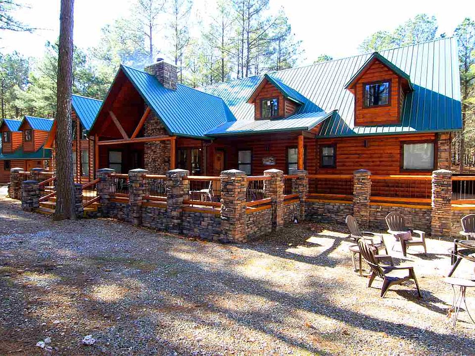 Mountain Creek Lodge is a two-story, unique forest getaway, expanding to 3,900 sq. ft. of true luxury, with a great twist of southwest flavor. You will LOVE the mix of plush and old world furnishings. The center focal point of the cabin is the huge U-shaped granite kitchen island bar, which will seat 13 - 16 people. Other wonderful features include an amazing chef's dream custom designed kitchen with large beams, 20-foot ceilings, all upgraded stainless Gallery appliances, including a wall oven, 36-inch 5- burner electric cook top and two sinks for the chefs in the group. In addition to the granite island, there is a pub table for seating 4 people. Sink into the kidney-shaped vintage fringed comfort of the over sized Great Room, and gaze into the fire in the two-story stacked stone wood-burning fireplace. High beamed vaulted ceilings. Other unique features are 2 private lofts, 2 full kitchens, custom granite, window treatments & ceiling fans throughout, a game room, a media room, hot tub.each bedroom has their own bathroom and there are two other half baths.