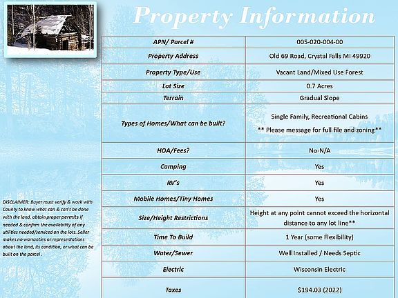 Come build your recreational getaway or bring your RV/Camp to this waterfront lot! Approx. 160 Feet frontage to the Michagamme River. Well already on the property!