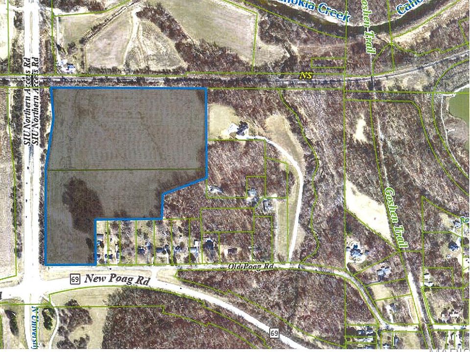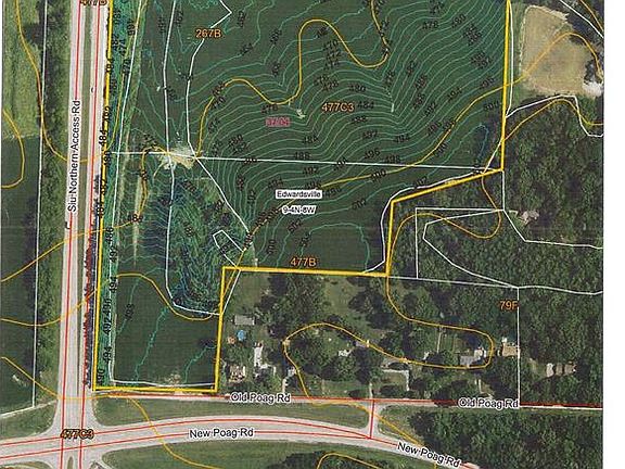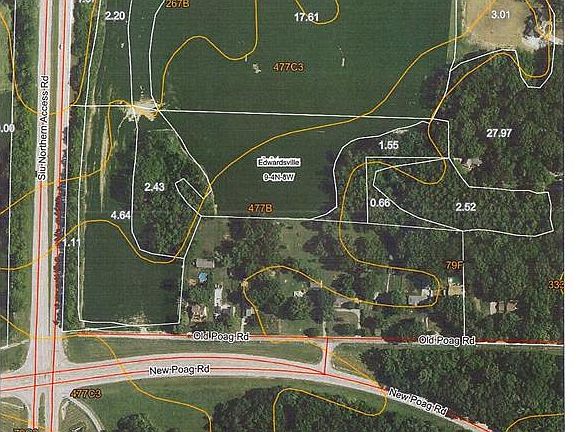 Two parcels containing 37 contiguous acres. Approximately 30 acres of tillable land, ample road frontage along Old Poag Road with possible access off of the SIUE Northern access Road (per IDOT approval). Great visibility at the intersection of New Poag Rd & SIUE Access Rd. Electric, Natural gas and Public water available nearby. Sold subject to tenant’s rights. Madison County, IL would be in charge of any zoning questions.