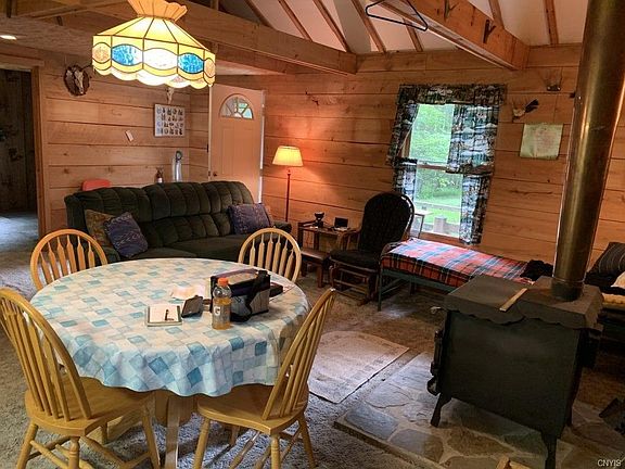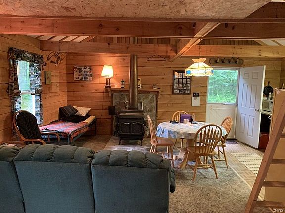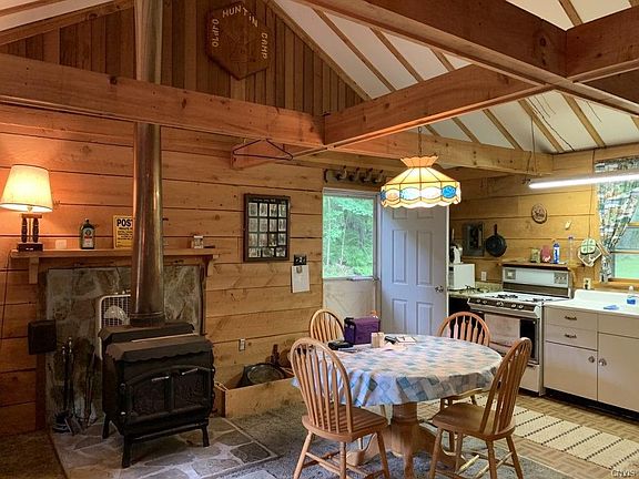 This 600 sq. ft. cabin has 2 spacious bedrooms with another bedroom in the loft, full bathroom, open living room/dining room area off of the kitchen, large wood stove for heat, and electric, septic and well are installed. Plenty of space for family and friends to enjoy. The metal roof is only 8 years old. The 3 acres is partially wooded with whitetail deer and other wildlife signs throughout. Large open area next to the cabin for bonfires, hanging out and relaxing. Nice gravel driveway off the road for parking. Just down the road is 1,100 acres of the Pine Hill State Forest perfect for hunting, hiking and enjoying the outdoors!