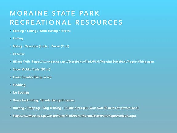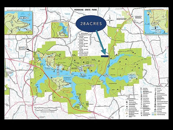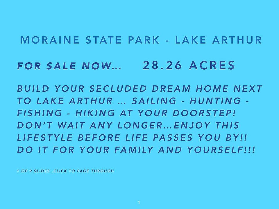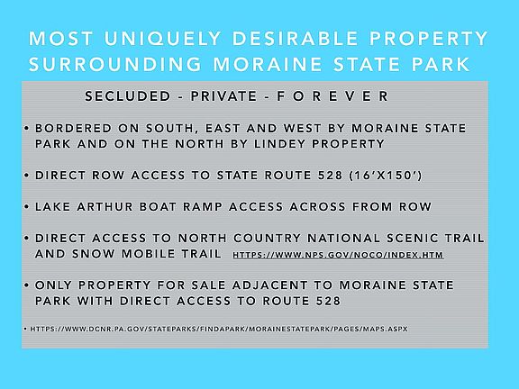 Secluded 28 acre homesite adjacent to Moraine State Park, Lake Arthur PA...surrounded on three sides by State Park... the only land for sale that is adjacent to the park with direct ROW access to Prospect Rd / Route 528. All land surrounding Lake Arthur is owned by the state of PA...Moraine State Park. You can't get any closer to the lake and the Park resources than this.