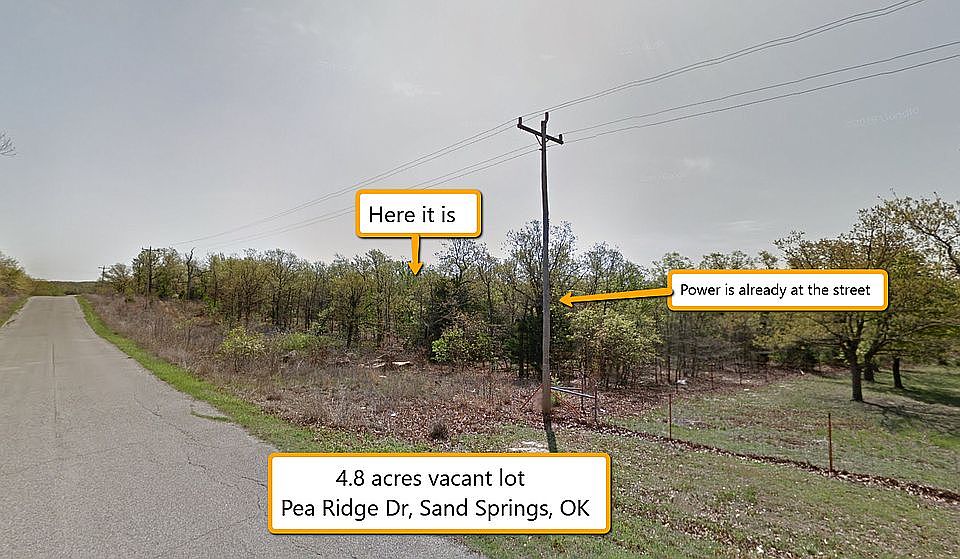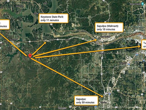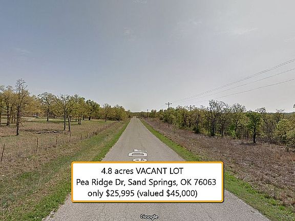 Breathtaking nature and at the same time close to a metropolitan city… not possible? Yes, it is! Come and visit this 4.8 acres lot at Pea Ridge Dr near Sand Springs. You will be able to enjoy the nature and privacy on this spacious lot. At the same time you may enjoy the amenities of a large city with its shopping centers, restaurants, schools, doctors… Tulsa OK is just a 29 minutes drive away! You prefer being in the nature? No problem, you will find Mannford Reservoir within a few minutes. Walmart / Sand Springs just 19 minutes. Assessed value is more than $40,000, we sell it for only $25,995 if you pay in full. Short on cash? No problem – we finance. Impossible? We make best value deals possible. Contact us today!