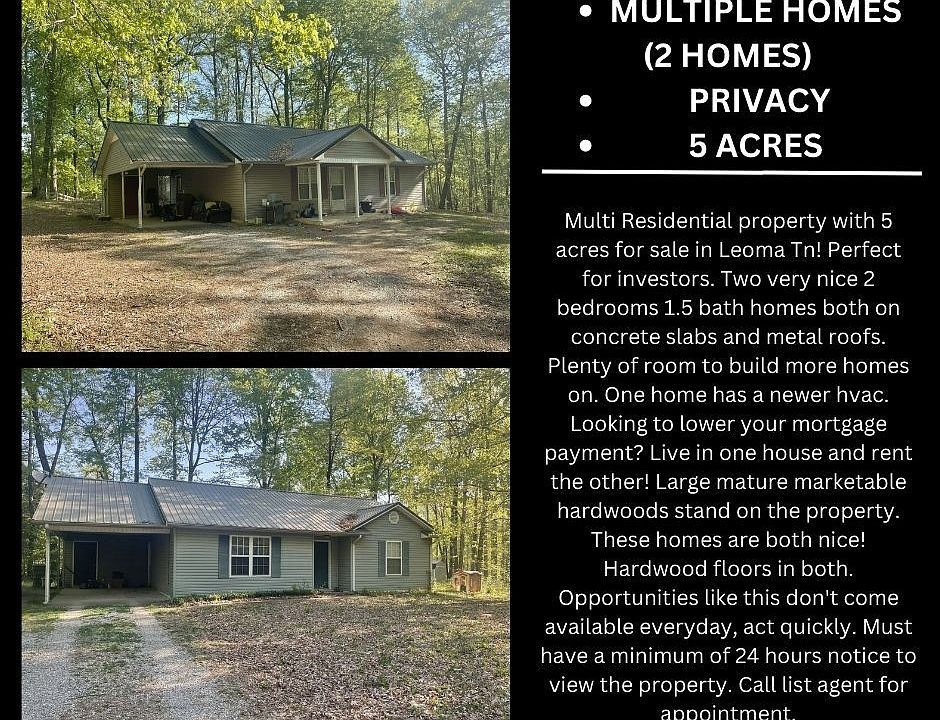 Multi Residential property with 5 acres for sale in Leoma Tn! Perfect for investors. Two very nice 2 bedrooms 1.5 bath homes both on concrete slabs and metal roofs. Plenty of room to build more homes on. One home has a newer hvac. Looking to lower your mortgage payment? Live in one house and rent the other! Large mature marketable hardwoods stand on the property. These homes are both nice! Hardwood floors in both. Opportunities like this don't come available everyday, act quickly. Must have a minimum of 24 hours notice to view the property. Call list agent for appointment.