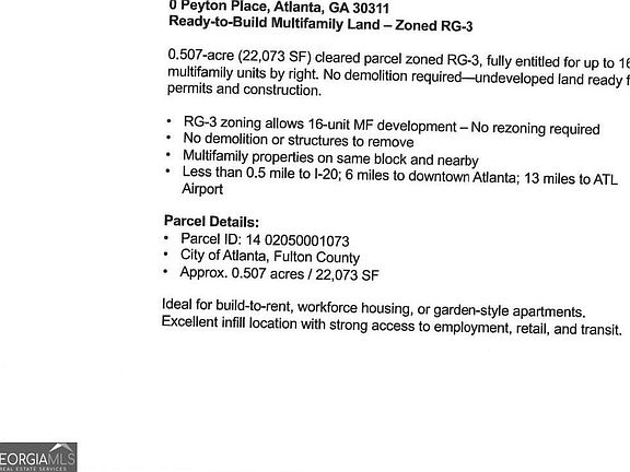 Location, location, location. This ready to build multifamily land zoned RG-3 is ready for permits and construction. No demolition required. No rezoning required. Fully entitled for up to 16 multifamily units. There are multifamily properties on same block and nearby. Less than .5 miles to I-20, 6 miles to downtown Atlanta, 13 miles to Hartsfield Jackson Airport. Ideal for build-to-rent, workforce housing, or garden-style apartments. Excellent infill location with strong access to employment, retail, and transit.