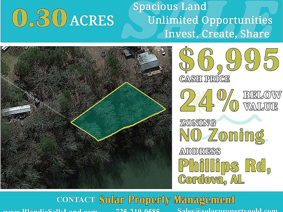 Riverfront, UN-Zoned 0.30ac Lot with Slope to Water! Advantageously Price 24% BELOW value **************************** Contact Solar Property Management to learn more: 725-219-0585 - sales@solarpropertygold.com **************************** Unrestricted Land Use opens a World of Opportunities! Start experiencing the advantages of a Waterfront life Now! Plus this lot is also conveniently located near a Great selection of Schools, Restaurants & Shopping too! And, aside from Fishing the area has a variety of other outdoor activities, like the Fun, but Challenging Obstacle courses offered at Flip Side Watersports, less than 1 hour away. And Remember owning an UN-zoned property means UNLIMITED usage options!! Create a Fishing GetAway from your Private deck or Backyard, place a Mobile/Manufactured house, Camp, create a Garden, Harvest Timber & so much more! The choice is yours! Grab this STEAL today, while available! Call us now to learn more or make an offer! **************************** This Multi-functional lot has legal access only as no paved or unpaved roads lead to the property. You can use these coordinates to find the property via Google maps: 33.795837, -87.089525. The adjacent neighbors address is 2825 Hwy 78. Walker County unzoned areas allow UNrestricted Land use, which makes this property INVALUABLE! City connections are available for water, but a private septic system must be installed. Electricity & Phone connections are available at the street. **************************** Buyer must verify & work with County to know what can & can't be done with the land, obtain proper permits if needed & confirm the availability of any utilities needed/serviced on the lots. Seller makes no warranties or representations about the land, its condition, or what can be built on the parcel. **************************** We’ve made purchasing this lot easy with multiple payment options. Or buy with $6,995 CASH **************************** Being about 30 minutes to Birmingham & just under 1.5 hours to Tuscaloosa & Decatur, means trips to these Exciting cities will be a breeze! And your mouth will Thank us for encouraging you to try some of the Fantastic Eateries Nearby! This area has it ALL from Delicious Smokey BBQ at Deano's Hickory Pit to the Finest Home-Cooked food anywhere from Victoria's Restaurant & Bakery & Great Quality Mexican food at Speedy's Mexican restaurant, you won't get bore with dining options! Plus the Amazing Ave Maria Grotto is only 52 minutes away! Whether you Love Catholic statues or what to simply Enjoy the flora Serenity, these Picturesque trails & sights is something you won’t forget! **************************** Purchasing property from us is quick & effortless. This property will be closed by a local title company & is guaranteed to be free of all liens and encumbrances. Buyer will receive title insurance & warranty deed. Message us here/call us today to get started. **************************** Purchase this land with cash for $6,995, other payment options available. **************************** Property Details: Lot Type - Land Sale Price - $6,995 State - Alabama County - Walker Assessor's Parcel Number - 15-09-29-0-000-018-0000 Property Usage - Unzoned lot, Unrestricted Land Use - Single Family, Mobile/Manufacture, Camping, Agriculture & more! Property Address - 0 Phillips Rd Lot #: C, Cordova, AL 35550 Size - 0.30 Acre(s) Access - Legal, unpaved Phillips Rd stops at adjacent adjacent neighbors lot Water - City Septic - Private Market Value - A 0.68ac lot nearby is listed for $10,900 **************************** To buy this lot at this discounted price call/txt/email Solar Property Management @ 725-219-0585, sales@solarpropertygold.com. Note: Other properties at bargain prices are available! Don't miss out on these great deals call/text us now!