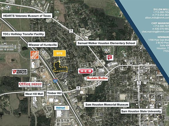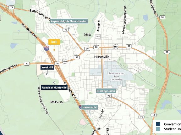POTENTIAL USES Multifamily, Student Housing, Townhome, Single Family Residential, MHP (Conditional Use) Light, Industrial, General Commercial, Self Storage, Institution/Civic/Gov’t Use, Special Use. Perfectly located development site on I45. Excellent highway I-45 visibility and signage (without the freeway noise issues), 3–5-minute access to Sam Houston State University and 3 minutes to all major new retail and commercial West of I-45. Development agreement with the city includes the extension of Pine Shadows Drive, a critical infrastructure enhancement that promises to bring substantial benefits. This extension will facilitate traffic flow to and from the feeder roads, thereby increasing site accessibility and exposure. Moreover, it creates a strategic hard corner at the property fronting the I-45 frontage road, maximizing visibility and potentially increasing the site’s commercial value. City of Huntsville agreed to provide water/sewer capacity for at least 300 apartment units.