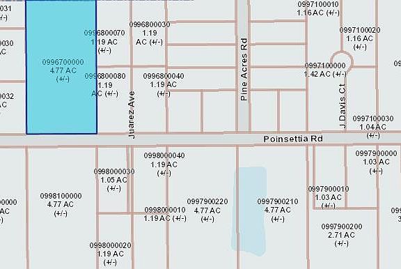 9.4 acres or can be sold separately 4.7 acres at $50,000 per lot. OR zoning allows single family with animals. Poinsettia Rd is platted but ends at Juarez Ave. Poinsettia divides the 2 lots. Section of road will need to be put in to property. This is two 4.7 acre lots and 2nd lot is located on the other side of Poinsettia. Priced to sell! Country living at it's finest.