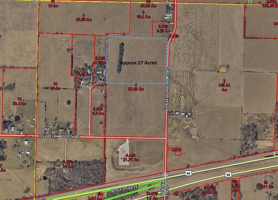 Great location just east of Rogersville! Approximately 27 acres open land in Webster County. No restrictions! Easy access to Highway 60 with paved road frontage. Boundary lines in picture are approximate. Survey has been done and attached to listing.