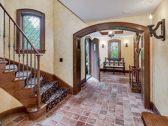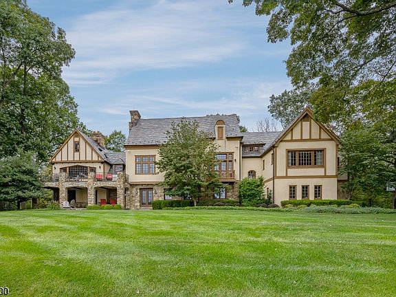 Exquisite Country Retreat on the Bernardsville Mountain A beautiful country retreat idyllically set on the Bernardsville Mountain overlooking panoramic views of the Somerset Hills. Custom built in 1935 and extensively renovated and expanded in 2005, this stylish three-level home contains six bedrooms, five full baths and a powder room. Situated on over 8 acres, the grounds are enhanced by professional landscaping and hardscaping. Impressive outdoor enhancements include a pool and stone pool house (unfinished interior in a private garden setting. Entertaining is effortless on open and covered bluestone terraces amid stone walls, bluestone walkways and landscape lighting. Highlights of the character-filled interior such as layered and custom-crafted crown moldings, quarter sawn random width oak floors, numerous built-ins, five fireplaces with gas starters, leaded glass windows, and some radiant heated floors showcase the level of care put into the restoration of this Tudor style estate. Approached by a long, winding drive to the front parking court, this handsome residence is finished in genuine stucco and stone with a slate roof. An innovative 7,100+ square-foot floor plan arranged on three levels is introduced on the ground floor foyer beyond a custom wood door with leaded glass window where details include an arched opening, terra cotta tile floors and plaster-finished walls. This entryway leads to a winding staircase that climbs the stone turret to the main level. Here the dramatic great room is set under 28-foot vaulted and original wood-beamed ceilings. Overlooked by a loft, this congenial space has a floor-to-ceiling fireplace, wood coffered ceiling above the dining area, transom-topped French doors to an upper terrace, and a door to the balcony. Another inviting place is the family room featuring wood-beamed ceilings, custom oak paneling, a fireplace, built-in speakers and a window wall framing views of the pool and terrace. Leading from the family room is a fabulous gourmet kitchen designed with a roomy granite-topped center island featuring a prep sink, wood-beamed ceilings, soapstone counters, and a collection of upper-end appliances from Viking, Sub-Zero, Miele, Dacor and GE. A built-in pizza oven with wood storage is tucked into the fieldstone surround. A separate wing consists of a primary suite with beautiful views and anchored by an elegantly mantled limestone fireplace and built-in speakers. Wardrobes are easily organized in a spacious walk-in closet and separate shoe closet. The primary bath presents a Jacuzzi tub with Perrin and Rowe faucet, a tumbled marble steam shower, private water closet, double sink vanity capped in granite and built-in speakers. Two more bedrooms share another graciously full bath. Also in this wing is the conveniently located laundry room with Whirlpool Duet washer and dryer. On the second level is the airy loft with wood beamed ceiling, built-in bookcases and views into the great room below. Two more bedrooms, two walk-in closets (one cedar and a full bath complete this level. The unfinished basement contains utility and storage rooms. Returning to the ground floor, gatherings are welcomed in the gracious beamed ceiling recreation room offering a fieldstone fireplace, door to the terraces and random width oak floors. A hallway leads to the fireside billiards room and secondary kitchen featuring upper-end appliances, custom ivory cabinetry and granite counters. This level also has an en suite bedroom, exercise room and another full bath. A mudroom with custom built-ins and access to the two-car garage and one-car garage with workshop complete this level. Bernardsville in Somerset County is conveniently located 33 miles from Manhattan, 23 miles from Newark Liberty International Airport, and close to NJ Transit's Midtown Direct trains in downtown Bernardsville. A network of interstate highways includes Routes 202, 78 and 287, while bus service to New York is available in Far Hills or Bernardsville. Highly rated public and private schools, world-class golf courses, fine dining and designer shopping are available locally. The property is farmland assessed for woodland management.