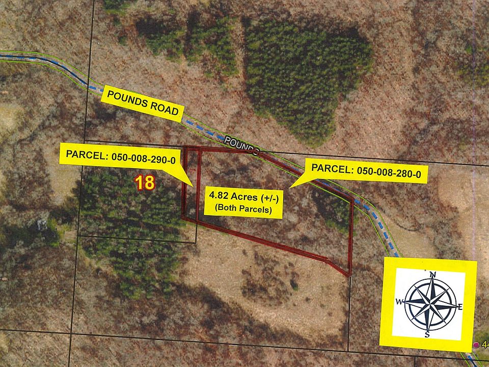 This 4.82 acres (2 parcels) is being sold at an ONLINE PUBLIC AUCTION on which bidding commences NOW and closes (ends) Thursday, February 15th, 2024. NOTE: Use 5600 Pounds Road as an address for GPS & it should get you in front of the property (at our sign). Also, the Auditor references a 12' x 56' single wide mobile home, well & septic. The mobile home has not been used for more than 35 years & the Auditor is showing '0' valuation for improvements. And, the Trustee has no further details as regards mobile home, well or septic. The 4.82 acres (+/-) consists of 2 adjacent & contiguous parcels of 4.44 acres & 0.38 acres (+/-) & are being sold together. See April 17, 1974 survey (attached). Also, see 'A2A' for bidding information.