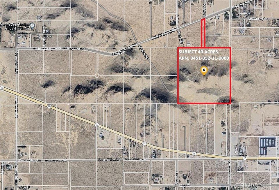 40 ACRES JUST SOUTH OF RABBIT SPRINGS IN LUCERNE VALLEY: This land offers an abundance of opportunities for the buyer with its unique terrain. Utilities are along Rabbit Springs Road. Property's ingress and egress is a 30 foot-wide recorded easement entering from Rabbit Springs Road. Visit the property and imagine the possibilities ... future home site ... investment ... you decide! MOTIVATED SELLER MAY DO SELLER FINANCING!!