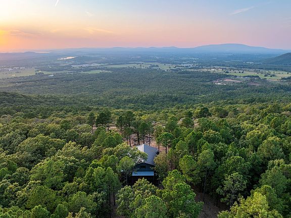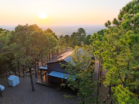 Welcome to Heaven's Ridge, a one of a kind mountain retreat perched high above the town of Heavener in Le Flore County, Oklahoma. This custom built, +/- 1,416 sq. ft., 2 bed, 2 bath cabin sits on a private +/- 2 acre lot at 1,200 ft. elevation in the Ouachita Mountains, offering some of the most breathtaking panoramic views in all of Oklahoma and Arkansas. Overlooking Heavener, Wister Lake, Cavanal Hill, and the San Bois Mountains, this property truly lives up to its name. Step inside to discover reclaimed 70 to 80 year old wood thoughtfully integrated throughout the cabin, polished concrete floors on the main level, and vaulted pine ceilings. The spacious, open concept kitchen features Sierra White veined quartz counters, a custom 4'x9' reclaimed wood island, and full size appliances. Including stove/oven, dishwasher, and a 33 cubic foot refrigerator, all of which convey with the property. The main living area centers around a stunning, floor to ceiling stone fireplace with a solid 160 lb cedar beam mantel. The primary suite and bathrooms feature reclaimed wood accents, with custom touches such as hand built pine benches and a master bed crafted entirely of reclaimed pine. Upstairs, the loft bedroom offers additional space with sweeping mountain views and integrated bunk beds built in. Enjoy the outdoors year round with +/- 1,020 sq. ft. of covered porches, complete with 3" thick cedar bar tops, oversized cedar posts, black rebar rail accents, and an overhead garage style door that frames the San Bois Mountain range. Perfect for merging indoor comfort with the beauty of the surrounding landscape. The cabin is as functional as it is beautiful, featuring a private 400 ft. water well with sediment filtration and an 80 gallon pressure tank, a 500 gallon owned propane tank powering a tankless water heater, washer and dryer, as well as a 2 ton Amana electric HVAC heat pump that can be controlled remotely with a phone app. Electricity is provided by a solar power system, with 30 roof mounted panels, an EG 4 18Kpv inverter, and dual EG4 14.3 kW batteries providing a total of 28 kW of storage. Starlink internet, excellent cell service from a nearby tower, and Ring doorbell security ensure modern comfort and connectivity without sacrificing the peace of mountain living. The property offers a circle drive with parking for 2 to 5 vehicles, easy access via a newly built mountain road, and privacy surrounded by red oaks, black oaks, maples, pines, cedars, and more. Wildlife is abundant, with opportunities for hunting Eastern turkey, black bear, and trophy whitetail deer. Nearby Wister Lake and the Ouachita National Forest provide endless opportunities for fishing, hiking, ATV riding, camping, and exploring. The location combines privacy with convenience, just a +/- 8 minute drive from Heavener, +/- 12 miles south of Poteau, +/- 40 miles to Fort Smith, Arkansas, and +/- 70 miles north of Hochatown. Runestone Park, famous for its Viking inscriptions and rich cultural history is directly below the cabin. Adding to the unique character of this mountaintop escape. This property is more than just a cabin, it's a rare opportunity to own a private retreat with endless potential. Property boundary lines will be subject to a survey. All showings are by appointment only. Disclaimer: The boundary lines shown are approximate and are provided for general reference only. AHLC makes no representations or warranties, express or implied, as to the accuracy, completeness, or reliability of those property lines. Buyers are advised to obtain an independent survey to verify exact property boundaries.